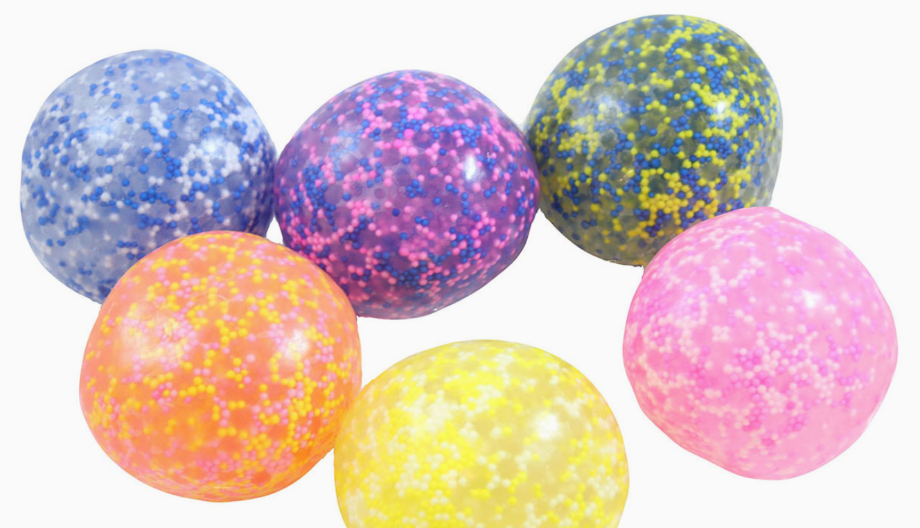 SET OF 1 INDIVIDUALLY WRAPPED BALLS - These large 2.5" stress balls are so fun and unique. The balls have a soft flexible clear skin and are filled with a thick gel-like filling that contains small bead-like confetti balls. When you squeeze the balls, they retain their shape which makes them a fun and unique sensory ball that makes a perfect fidget. You can gently flatten the ball, or pinch and shape it in your hands. It almost reminds me of playing with dough without the mess. The balls are a bit sticky at first, but the tackiness goes away with use. Balls available in 6 fun colors.
