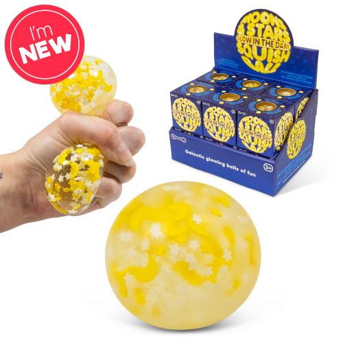 Glow in the dark squishy ball featuring a stars and moon design This brightly colored groovy glob glows in the dark and is the perfect tool to help anyone unwind and relieve stress. Its great fun and irresistible to squeeze. Featuring a stars and moon design, the squishy texture helps to reduce tension and promote relaxation. It can be used as a stress ball or just to fidget with while working or studying.